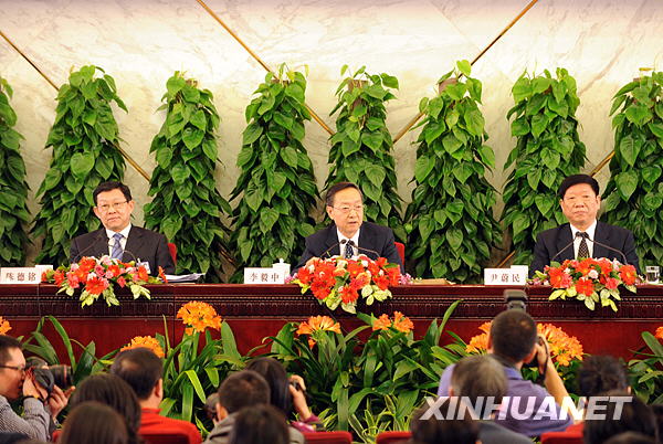 3月10日,十一屆全國人大二次會議舉行記者會,工業(yè)和信息化部部長李毅中、人力資源和社會保障部部長尹蔚民、商務(wù)部部長***答記者問。新華社記者陳樹根攝