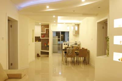 經(jīng)過大手筆空間改造的居室,就好像在一幅空白藍(lán)圖上重新進(jìn)行了規(guī)劃,既對空間進(jìn)行了改造,更能夠?qū)崿F(xiàn)一些帶有創(chuàng)意性質(zhì)的設(shè)計。李云家的客廳與餐廳便是如此。她最初的構(gòu)想是,既然拆除了一道墻,就是想要一種非常通透的感覺,而且希望這個空間既有必要的功能劃分,同時還能呈現(xiàn)出一種整體感。于是設(shè)計師為她繪出了一張包含著雙弧線的圖樣:以客廳電視機背景墻那一面為一個大的半圓弧,連接起餐廳與之相對的一面墻上一個小的半圓弧。圓弧的構(gòu)型既表現(xiàn)在吊頂上,同時也延伸到整面的墻體。