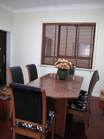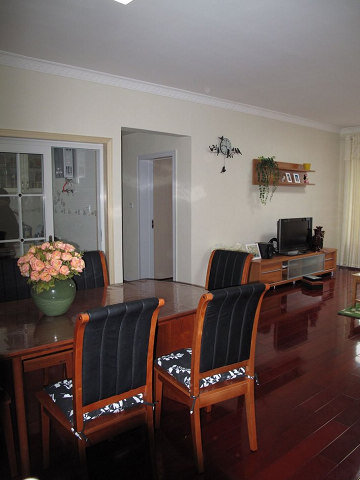 一進門就是餐廳,餐廳和客廳沒隔斷。餐桌也掌上明珠的,櫻桃木的,木質(zhì)很好挺穩(wěn)重。。。