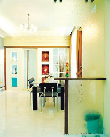進(jìn)入門戶,就是一個吧臺形的玻璃屏風(fēng),它向上和天花板相連在一起,而在玻璃屏風(fēng)上則放了一個造型簡潔的玻璃瓶,瓶內(nèi)放入一些艷麗色物,起到畫龍點(diǎn)睛之筆。