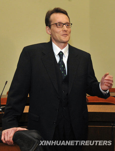3月9日,瑞士男子黑爾格·斯加爾比(中)在律師的陪同下來(lái)到德國(guó)慕尼黑的法庭接受審判。新華社/路透