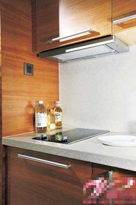 抽油煙機(jī)的煙道被櫥柜包裹起來,灶具同樣小巧而美觀。