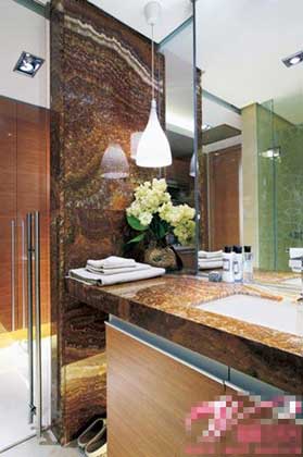衛(wèi)浴間的地面和墻面采用了同樣紋理的石材進(jìn)行了鋪裝,晶瑩光滑的表面將光線進(jìn)行了全面的反射,把有限的空間進(jìn)行了無限的放大。