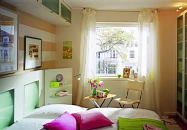 臥房應設有窗戶,除了空氣得以流通,白天更可以采光,使人精神暢快,而晚間窗戶應備有窗簾,擋住戶外夜光,使人容易入眠。