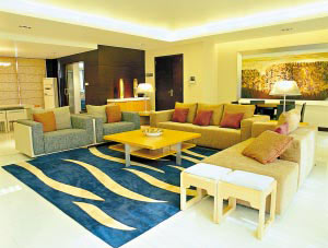 為更微妙地表達這種和諧,設計師在顏色上進行嚴格的控制。據介紹,在灰色基調下,通過灰暖(灰黃、灰紅)、灰冷(灰藍、灰紫)的搭配產生既和諧又有變化的韻味,形成一種清新透明的視覺效果。煙灰色的涂料,黑茶色的玻璃,淡淡的米黃石,暗紅的壁掛畫,簡潔的擺設,相互影襯,隨意的韻味。整個客廳因為融入變化的元素,所以感覺不會太單調。
