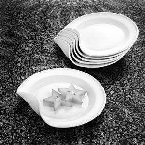 盤子的造型是很奇特,但是真的是為了方便實用。彎曲的卷邊,讓人能吃到最后的美味:把食物歸攏堆積到盤子邊上,就可以方便地取用。而不必像平盤那樣,把盤子送到嘴邊才能解決問題。