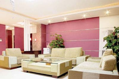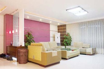 紫色背景墻最常用的地方是沙發(fā)背景墻。用紫色壁紙大面積鋪帖,只在柜式空調(diào)的后面留出相應(yīng)的白色部分,再用銀色金屬條橫著粘貼在壁紙上,既能保證整體色調(diào)的完整,又不會死板,而且銀色也是一種很高檔的顏色,整體看來很有品位。值得注意的是家具一定要選擇淺色的,不然客廳就會顯得很暗。