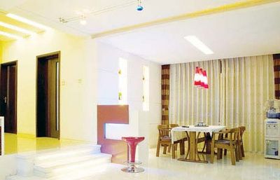 客廳主題顏色確定后,屋子的其它部分色彩也隨之確定。玄關(guān)處一側(cè)為廚房的外墻,用石膏板做成條狀,全部為紫色,在中間裝上落地鏡,既實用,又能擴展空間。另一側(cè)的鞋柜如果用紫色會顯得沒有層次,可以用色調(diào)接近的胡桃色,而墻垛則與另一側(cè)相協(xié)調(diào)均為紫色橫條。