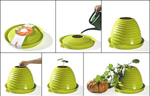 這個(gè)可降解的伸縮花瓶在拉伸開來并埋上種子澆水開始使用之后,可以保持正常狀態(tài)9個(gè)月時(shí)間,之后就可以拋棄到垃圾箱里,在大自然中完全降解。