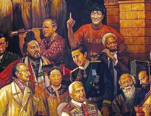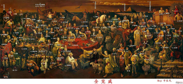 戴都都:我2006年春節(jié)過(guò)后和兩位朋友花了前后將近一年的時(shí)間畫(huà)了這幅畫(huà),而構(gòu)思多年前就有。1999年,我畫(huà)了一幅畫(huà)叫《中國(guó)故事》,也叫《老李頭兒的文物店》,利用“文物店”畫(huà)了幾百個(gè)中國(guó)文物,每個(gè)文物都講述了一個(gè)中國(guó)故事。這幅畫(huà)獲得了當(dāng)年文化部藝術(shù)大獎(jiǎng)的金獎(jiǎng)。之后我想像講中國(guó)故事一樣講世界歷史,于是就想通過(guò)把對(duì)歷史起重要作用的偉大人物超時(shí)空地放在一起構(gòu)成世界歷史。