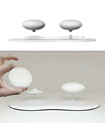 這其實(shí)是一只磁懸浮調(diào)料瓶,它的整體被設(shè)計(jì)成白色,共有三個(gè)部分:調(diào)料瓶、底座與基座。兩個(gè)橢圓形的調(diào)料瓶被安放在磁體支撐的小巧底座上,而這兩個(gè)小巧的底座通過(guò)與基座之間的磁力作用懸浮在空中從而起到對(duì)調(diào)料瓶的支撐作用。