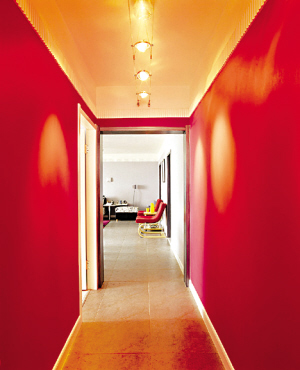 大膽地應用了亮紅色,一進門就可以感覺到濃濃的暖意,但設計師建議在走廊的兩邊懸掛主人的一些有回憶的照片,增加一下情調。
