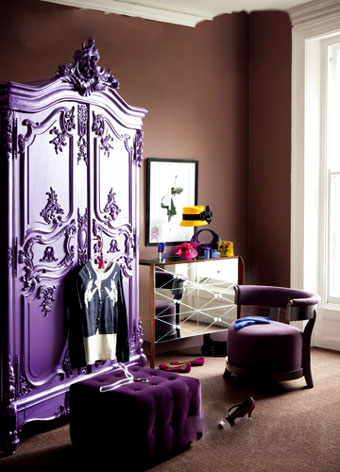 如果你是視覺沖擊力很強(qiáng)的色系的忠實(shí)擁護(hù)者,那么千萬不要錯過這個最奪目的房間造型。散發(fā)著珍珠光澤的紫色古典樣式衣柜,觸感舒適的絲絨沙發(fā)凳,搭配用鏡面裝飾的梳妝臺,制造出位的華麗效果。