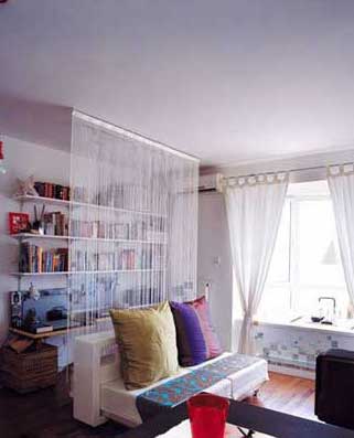空間分割并不單純依靠墻壁,很多軟性的裝飾也能起到同樣的作用,在視覺和感覺上使空間既能獨立存在,又能與其他空間共通,避免擁擠的感覺。