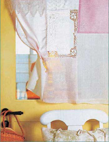 制作簾子時最好選擇稍薄的材料,準(zhǔn)備大小不同的幾塊布料,分別繡上需要的圖案。最后,用針線將布料縫綴成為簾子就可以了。如果覺得刺繡有點困難的話,可以利用已經(jīng)繡有圖案的手帕,也不失為一種好方法。