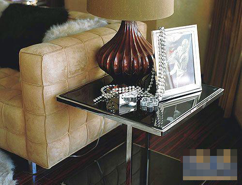 這里的茶幾是平淡無(wú)奇的一件家具,只因?yàn)殓R面的作用,它在桌面上倒映出的擺設(shè)變成了角落里的風(fēng)景。