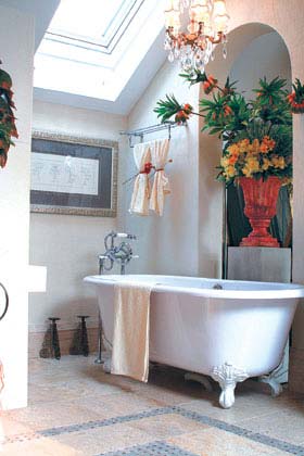 衛(wèi)浴空間選用整體的套間潔具,線條柔和簡(jiǎn)約,潔具、浴缸、手盆柔和的邊角和光滑的表面,非常具有質(zhì)感。浴鏡的邊框是用枝葉手編的,呈花環(huán)狀,充滿浪漫氣息。美式衛(wèi)浴就是這樣,他們非常注重衛(wèi)浴這個(gè)隱私空間的質(zhì)感和舒適度。樣板間的干濕分離、潔具光潔的釉面和新型的設(shè)計(jì),沿著斜屋頂搭建的浴缸等都體現(xiàn)了他們追求舒適的心理期待。