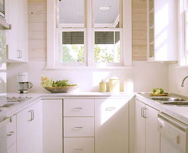 如今設(shè)計師的創(chuàng)意能將整個廚房都藏了起來:在一字形或L形櫥柜 兩側(cè)分別設(shè)計一個立式儲物柜,此柜的四面能依次拉伸,組合成一扇長長的柜門,需要時,就可 將此四扇門向中間合攏,將中間的工作臺、吊柜和地柜都掩藏起來。