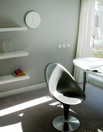 陽臺上又設(shè)了一個(gè)書桌,坐椅非常有質(zhì)感,陽光透進(jìn)來射在坐椅上,就像一件藝術(shù)品。