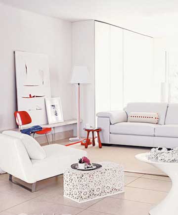 加入一些紅色元素使房間充滿現(xiàn)代感。一把經(jīng)典的餐桌椅,一個詭異的圓凳,一些細微而別致的鮮紅色裝飾;紅色的電話,話筒卻可以是白色,素色地毯的四邊只有一邊是紅色,白色裝飾畫,用剪開的方式呈現(xiàn)出內(nèi)部的紅色,紅色以不同的方式和形態(tài)出現(xiàn),引人注目卻又不喧賓奪主。