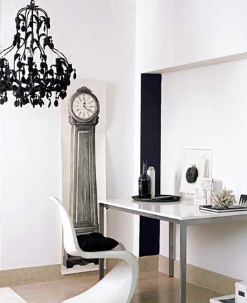 用混搭的風格來更新經(jīng)典的黑白搭配。一條簡單的黑色長條色塊增加了角落的深度,本來容易被忽視的角落反而成為了居室里的亮點。其它配飾的選擇除了顏色非黑即白之外,最好選擇不同的材質(zhì)和質(zhì)地,這樣就會有既豐富又單純的效果。