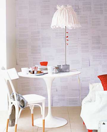 用復印的文稿裝飾個性墻面。將墻面涂滿膠水,然后粘上文稿。不要過于擔心是否整齊,不規(guī)則更增添其吸引力,其他的小工藝還包括用彩紙包裹椅子腿,或者在粉刷家具時,故意留下一部分,以及將臺燈的拉繩點綴上紐扣,而選擇紅色靠包可能是最簡單易行的調(diào)色方法了。