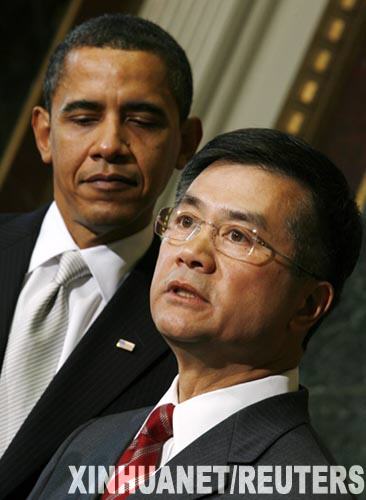 2月25日,美國(guó)總統(tǒng)奧巴馬(左)在華盛頓白宮的新聞發(fā)布會(huì)上提名前華盛頓州華裔州長(zhǎng)駱家輝(右)為商務(wù)部長(zhǎng)人選。 新華社/路透