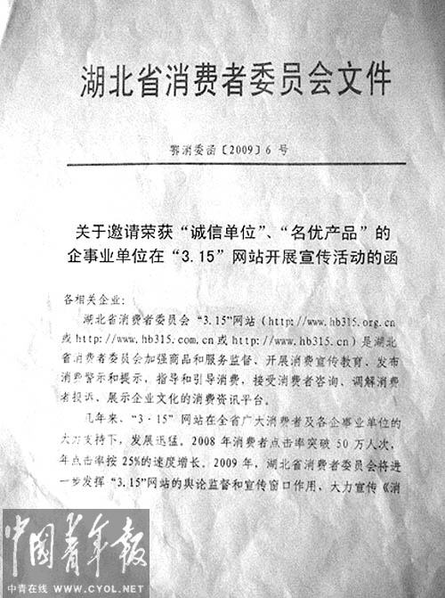 記者看到,這份文件名為《關(guān)于邀請榮獲“誠信單位”、“名優(yōu)產(chǎn)品”的企事業(yè)單位在“3·15”網(wǎng)站開展宣傳活動的函》,首頁確實標有“湖北省消費者委員會文件”字樣的紅頭文件,編號為“鄂消委函【2009】6號”。
