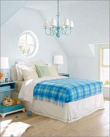 4.個空間給人的整體感覺是干凈而簡練,伴隨一些陽光的味道。溫暖陽光味道來自與暖黃色的床單,這與橘黃色條紋的窗簾相呼應(yīng)。而墻上那純凈到令人窒息的藍(lán),讓再煩躁的心情在此刻沉淀。