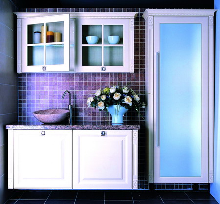 這套浴室家具尺寸并不大,但卻可以將衛(wèi)生間中常用的瑣碎之物——洗面乳、牙刷杯、剃須刀等都巧妙地隱藏在旁側(cè)高柜里,同時(shí)也可以將其他使用周期稍長(zhǎng)的洗滌清潔用品整齊地收藏在面盆下面的地柜中。加上整體的玻璃吊柜,可以拉伸出成倍的空間感。