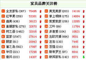 圖二是截至4月8日的家具品牌關(guān)注榜及關(guān)注度top10分布圖,跟圖一相比我們不難看出,品牌關(guān)注榜的普遍關(guān)注度均走上升趨勢(shì),排行第一由原來(lái)7萬(wàn)增長(zhǎng)到了十二萬(wàn),北方家具曲美超越了四川的全友榮登第一寶座,而緊跟其后的依然是全友、紅蘋(píng)果、皇朝等知名品牌家具企業(yè)。值得一提的是富之島家具由上月的排名第八竄升到本月前五名,關(guān)注度也大幅上漲。