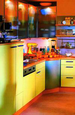 最理想的色調(diào)是單色調(diào)、淺色系,白色、淺灰色或明亮的奶黃色、淺藍(lán)色等都是不錯的選擇。不但明快,而且有擴大空間感的效果。出現(xiàn)在封閉式廚房里的色彩,通常是裝飾般的小點綴,如在護(hù)板設(shè)計上,用一條色彩艷麗的瓷磚,或一些小馬賽克,來激活略顯平淡的空間。