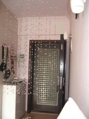 這是進(jìn)門的玄關(guān),風(fēng)水上說一定要有的.還要有個(gè)木鞋架.因?yàn)槲覀兊膽粜痛箝T對(duì)著陽臺(tái),是屬于散財(cái)?shù)母窬?所以加了珠簾擋住:)嘿嘿