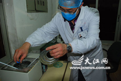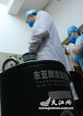 這邊在注射麻藥,那邊醫(yī)生在另外一間屋內(nèi)進行取精。負責(zé)取精的醫(yī)生唐海勛告訴記者,**開始是冷藏于-196℃的液氮罐里;之后,取出放入水溫36℃的水浴箱,進行平衡溫度并且保濕;再在分離器里將活**與死**分離,將活**聚集收集;再對其進行洗滌、激活。至此,完成取精過程。