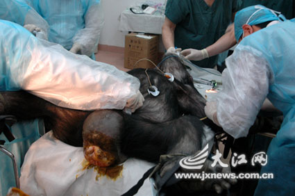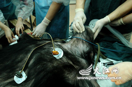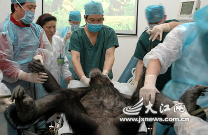 昌大一附醫(yī)院副院長王共先告訴記者,由于黑猩猩與人的構(gòu)造不一樣,給手術(shù)帶來了一定的麻煩。如插入輸精管時,剛一**去,卻發(fā)現(xiàn)不對,是尿道,不是**;還有,輸精管開始是按人用的長度標(biāo)準(zhǔn)使用的,后來發(fā)現(xiàn)短了。不過,這些小麻煩都被一一解決了。