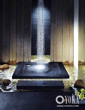 突破常規(guī)的浴室設計,取消了淋浴房常見的玻璃圍合,在浴室地面鋪上鵝卵石,幾塊大石隨意安置在鵝卵石上,浴室墻面則以本色防腐木為飾。沐浴之時,水流自上而下,仿若流瀑,而黑色裝飾百合花圖案的超平地面式鋼瓷釉淋浴盆,則保證了沐浴時腳部的舒適感。