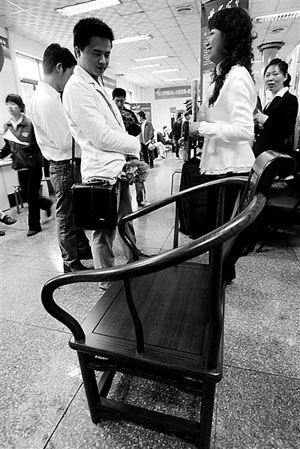 昨日,在武昌起點人力資源市場舉辦的湖南商會專場招聘會上,一招聘單位將一把新椅子放在招聘展位前,寓意虛位以待、求賢若渴,期待能招到更多的實用人才。