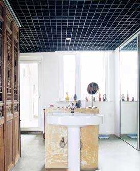 找回屬于自我的生活空間。全開(kāi)放式的浴室 與臥室渾然一體,只用吊頂和綠色植物的位置來(lái)進(jìn)行隱性分區(qū),浴缸后面的墻壁用馬賽克鋪貼出方形圖案,既是一種防潮處理,又與周圍灰色的碎石粒墻面形成色彩上的統(tǒng)一。