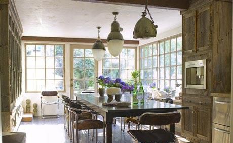 在這個空間里融匯了古代與現(xiàn)代的雙重元素?,F(xiàn)代簡潔的白色櫥柜與古董橡木櫥柜相應(yīng)成趣。古銅餐桌與寫滿滄桑的鐵藝座椅述說著歷史的韻味。一面古董陳列架更是為整個廚房空間增添了時光輪回的感覺。