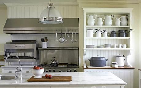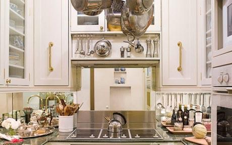 這款廚房它具有一張非常純凈的外表。櫥柜臺面采用精細(xì)打磨的卡拉拉大理石制成。灶具具有六檔火力調(diào)節(jié)。最出彩的在于對抽油煙機的設(shè)計,通過白色瓷磚砌成的墻面精細(xì)的包裹住油煙機,并在墻面上開鑿了擺放調(diào)料等的儲物架既美觀又實用。