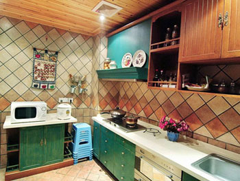 在這種色彩環(huán)境里,可以清爽為主導(dǎo)。鄉(xiāng)土氣息的顏色搭配讓人神清氣爽。相比于地面,墻面顯然有更大的發(fā)揮余地,因此是最好的表現(xiàn)場(chǎng)所。圖案是調(diào)制田園味道不可缺少的組成部分,精美圖案的組織安排,四方聯(lián)的整塊使用或二方聯(lián)的連續(xù)使用都會(huì)很容易被人接受。明亮的空間是讓空氣感到清新的重要因素,顏色含灰度不能高,要始終保持一定的亮度。而高明度的原木色或略含灰度的藍(lán)綠色在色彩感覺上比較對(duì)味,也更適合廚房。