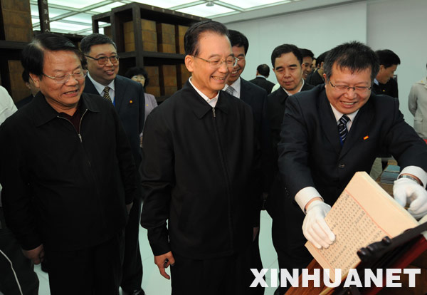 4月23日是“世界讀書日”。國務(wù)院總理***來到商務(wù)印書館和國家圖書館,與編輯和讀者交流讀書心得。這是***在國家圖書館欣賞館藏珍品。