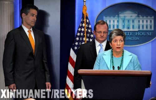 4月26日,在美國(guó)首都華盛頓,美國(guó)國(guó)土安全部長(zhǎng)珍妮特·納波利塔諾(右)在新聞吹風(fēng)會(huì)上講話。當(dāng)日,白宮就美國(guó)出現(xiàn)人感染豬流感病例舉行新聞吹風(fēng)會(huì),宣布美國(guó)豬流感患者增至20人,美進(jìn)入公共衛(wèi)生緊急事態(tài)。美國(guó)國(guó)土安全部長(zhǎng)珍妮特·納波利塔諾、美國(guó)疾病控制和預(yù)防中心代理主任理查德·貝塞爾(左)等出席了新聞吹風(fēng)會(huì)。 新華社/路透