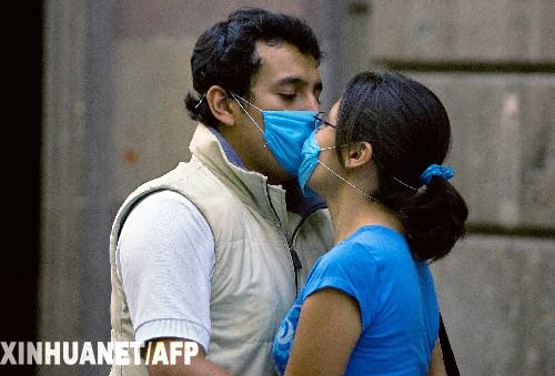 4月25日,在墨西哥首都墨西哥城,一對(duì)情侶戴著口罩接吻。墨西哥衛(wèi)生部官員何塞·科爾多瓦當(dāng)日通報(bào)說(shuō),截至24日晚間,墨西哥共有20人直接因感染豬流感病毒死亡,全國(guó)疑似病例達(dá)4000余人。 新華社/法新