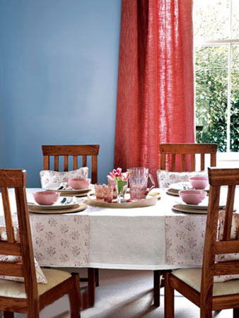 淡藍(lán)灰色墻面配以Romo淺紅色窗簾,長條餐桌上鋪以Hemstitch純白桌布,與布藝的木質(zhì)餐椅自然搭配,均來自Laura Ashley。椅上白底粉花的小靠墊與同樣白底粉花的桌旗、餐巾相互輝映。宜家白瓷質(zhì)主菜盤、小盤,以及淡粉色的小碗、淺紅色玻璃杯等無不流露出素雅的回歸。