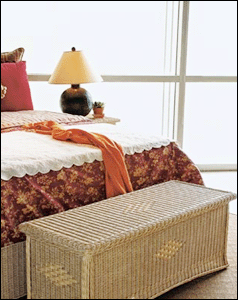 藤質(zhì)的床尾收納箱實用至極,內(nèi)部可以放置大量的過季床上用品,而且其堅實的表面可以放置一些輕巧的物品。