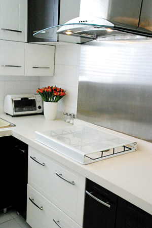 除此之外,還忌夾縫多。廚房是個容易藏污納垢的地方,應(yīng)盡量使其不要有夾縫。例如,吊柜與天花之間的夾縫就應(yīng)盡力避免,因天花容易凝聚水蒸汽或油煙漬,柜頂又易積塵垢,這們之間的夾縫日后就會成為日常保潔的難點。水池下邊管道縫隙也不易保潔,應(yīng)用門封上,里邊還可利用起來放垃圾桶或其它雜物。
