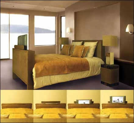 30000美元你會(huì)買輛車還是一張床?Bim Bam Banana終極電視床是一張內(nèi)嵌22'LCD電視機(jī)的床??纯聪旅娴拿枋觯?這是一張超級(jí)奢侈的床。只需按一下遙控器按鈕,床的一端會(huì)打開,悄無聲息地滑出一臺(tái)22寸平板電視機(jī),你可以享受任何你喜歡的節(jié)目。所有電子器件全都內(nèi)嵌在床體內(nèi)。你永遠(yuǎn)都不會(huì)寂寞--祝你好夢(mèng)!'