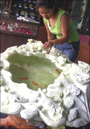 在成都送仙橋藝術(shù)城展出的一款身價(jià)16萬元的魚缸讓人大開眼界。該魚缸由1000公斤岫玉打造而成,工匠師傅花了足足半年時(shí)間。魚缸呈青白色,長1.2米,上面鑿了14只金魚,既傳統(tǒng)又不失現(xiàn)代特色。據(jù)魚缸的主人說,岫玉堪稱國玉,由此打造的魚缸極具收藏價(jià)值。
