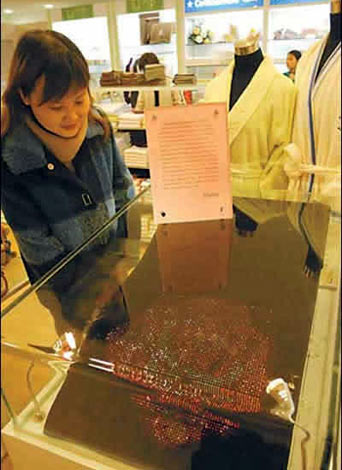 棉田家紡展示了一條價(jià)值近十萬元的貴價(jià)水晶毛巾,純黑色毛巾上鑲有4822顆大小、顏色各異的施華洛世奇水晶。這條盡顯奢華的毛巾全世界共有三條,中國僅此一條。水晶毛巾的面料選用奧地利具有70多年歷史的VOSSEN公司制作的一種高質(zhì)量的精梳棉,幾千顆水晶被鑲嵌成玫瑰花的形狀,具有極高的觀賞和收藏價(jià)值。不僅如此,這條水晶毛巾還可以隨意清洗,并不會(huì)掉色。據(jù)了解,這種水晶毛巾可以接受顧客定做。